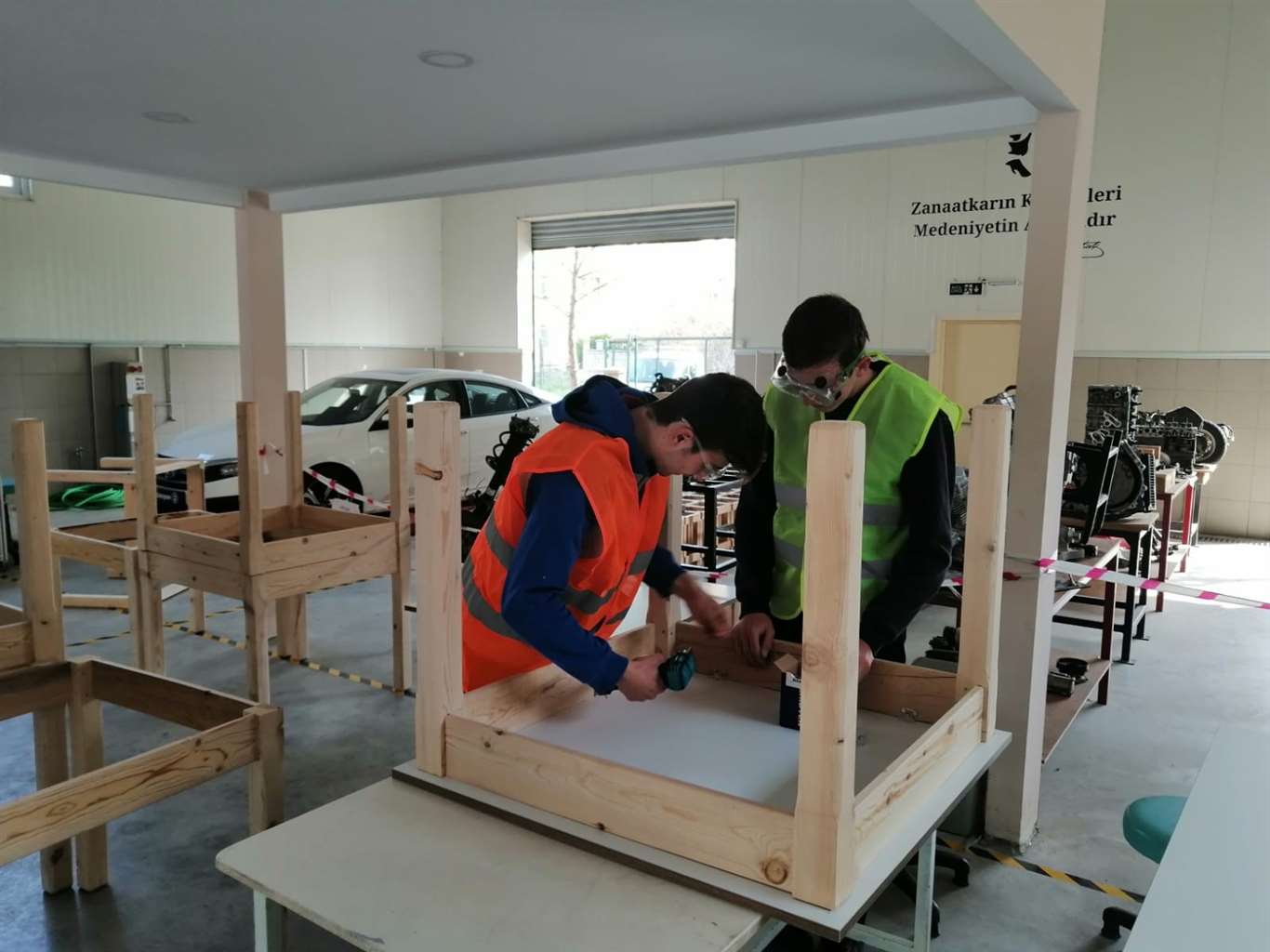 Fethiye'de öğrenciler depremzedeler için masa ve tabure üretiyor
