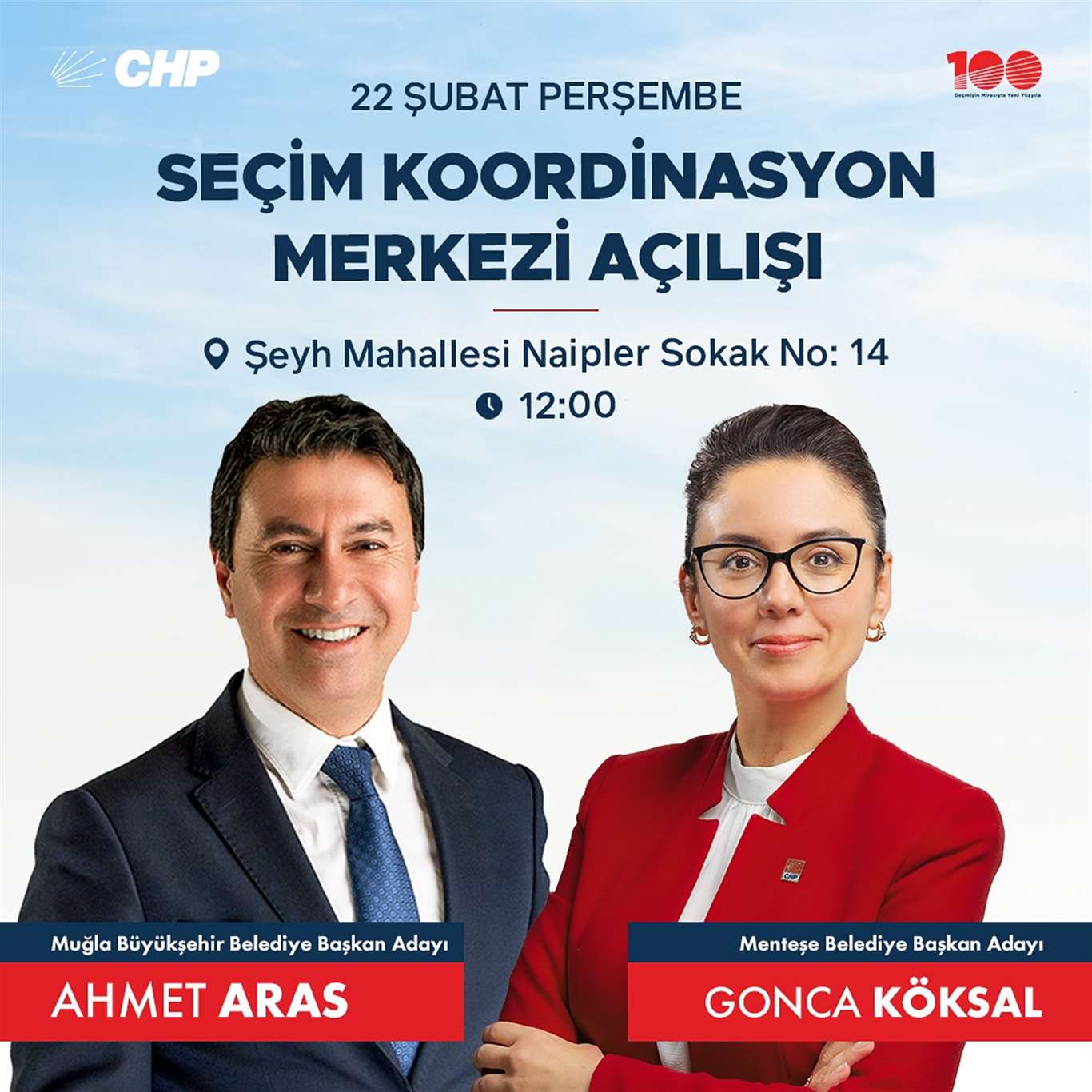 CHP Menteşe Belediye Başkan Adayı Gonca Köksal'ın seçim koordinasyon merkezi, Muğla Büyükşehir Belediye Başkan Adayı Ahmet Aras'ın katılımıyla açılıyor. Şeyh Mahallesi Naipler Sokak'ta (Kocamustafendi İlkokulu arkası) bulunan seçim ofisinin açılışı, 22 Şubat Perşembe günü saat 12.00'de gerçekleştirilecek.