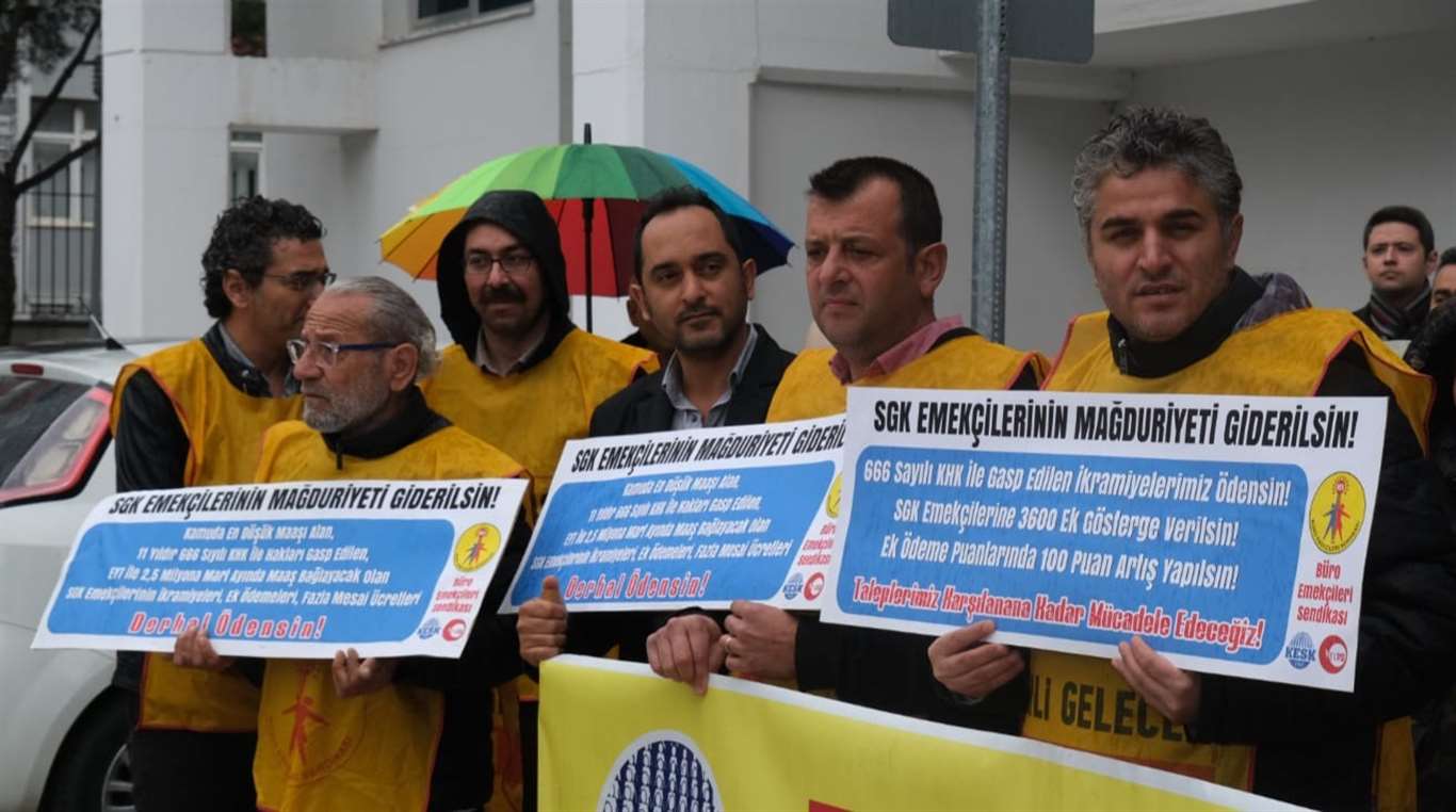 Devletimizin en kapsamlı kamu dinamiğini oluşturan kurumumuzda eşi benzeri olmayan iş yükümüze ve liyakatimize uygun maaş hakkımızı talep ediyor ve buradan bir kez daha sesleniyoruz: Sosyal Güvenlik Kurumu memurları olarak 2012 yılında haksız ve hukuksuz bir biçimde kesilen ve mahkeme kararına rağmen henüz ödenmeyen ikramiyelerimizi ve diğer ek ödemelerimizi geriye dönük istiyoruz! Sosyal Güvenlik Kurumu Ek Ödeme Yönetmeliğinde yer alan ek ödeme puanlarına 100 er puan eklenmesini istiyoruz! Ek gösterge düzenlemesinde 3600 kapsamı dışında bırakılan SGK çalışanlarına da 3600 ek gösterge istiyoruz! Hazine ve Maliye Bakanlığı'nda olduğu gibi, kurum içi uzmanlık kadrolarının ihdas edilmesini ve sosyal güvenlik tazminatı ödenmesini talep ediyoruz!